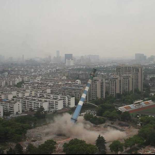 蘇州市地標建筑之一,矗立在蘇州城南的蘇州熱電廠大煙囪,該煙囪高80m,周圍有小區(qū)、學(xué)校、高架橋、小商品市場,爆破環(huán)境復(fù)雜。我公司技術(shù)人員仔細勘察現(xiàn)場后,編制詳細的爆破方案。最終于2016年8月26日下午3點整實施爆破拆除,伴隨蘇州人33年的電熱廠大煙囪從此成為歷史。